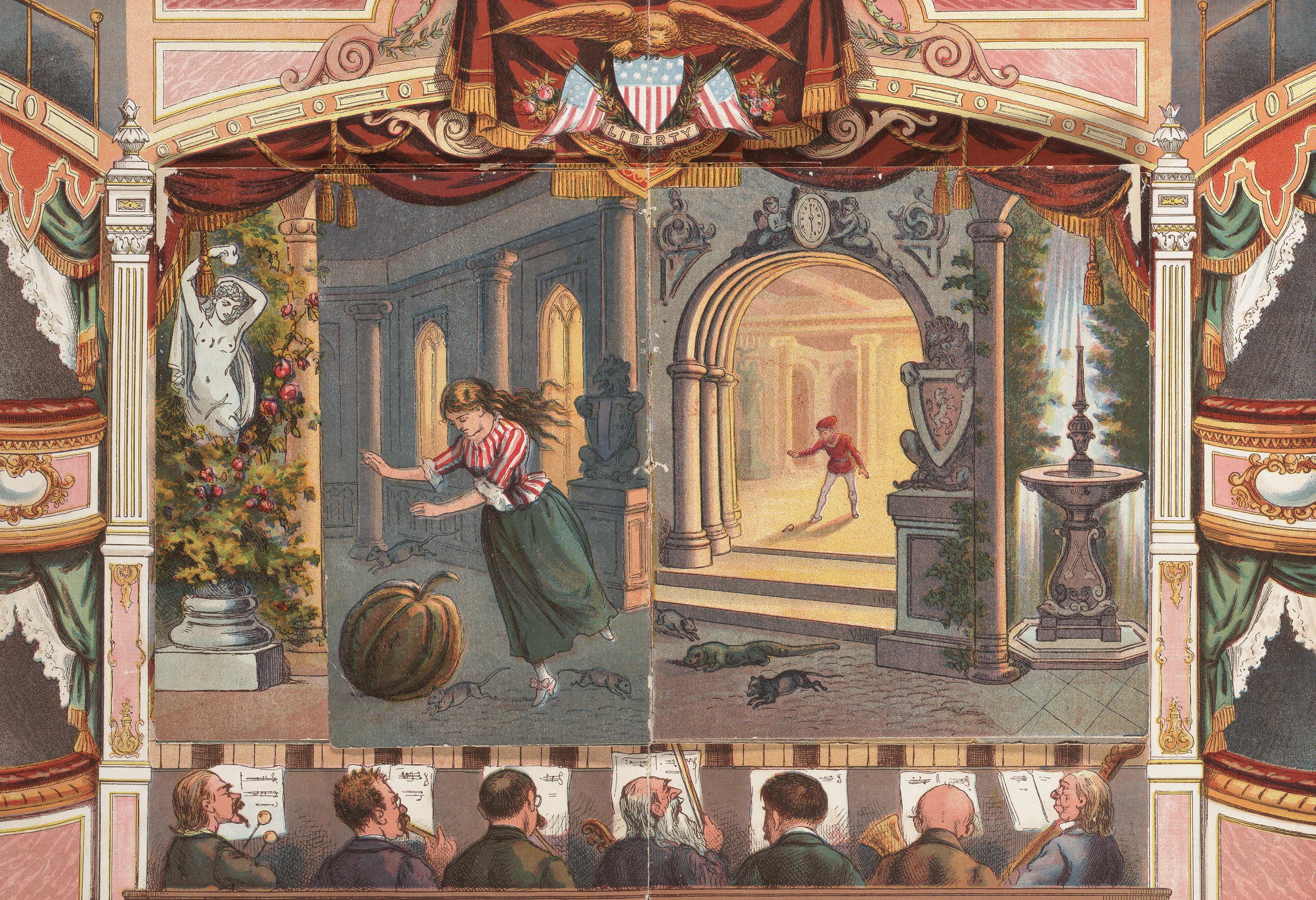 Después miró en la ratonera, donde encontró seis ratones vivos aún, y le dijo a Cenicienta que levantara un poco la trampilla; a cada ratón que salía, le daba un golpecito con la varita y el roedor se transformaba en un hermoso caballo, así hasta que tuvo un precioso tiro de seis caballos, de un bello color de ratón gris claro.
